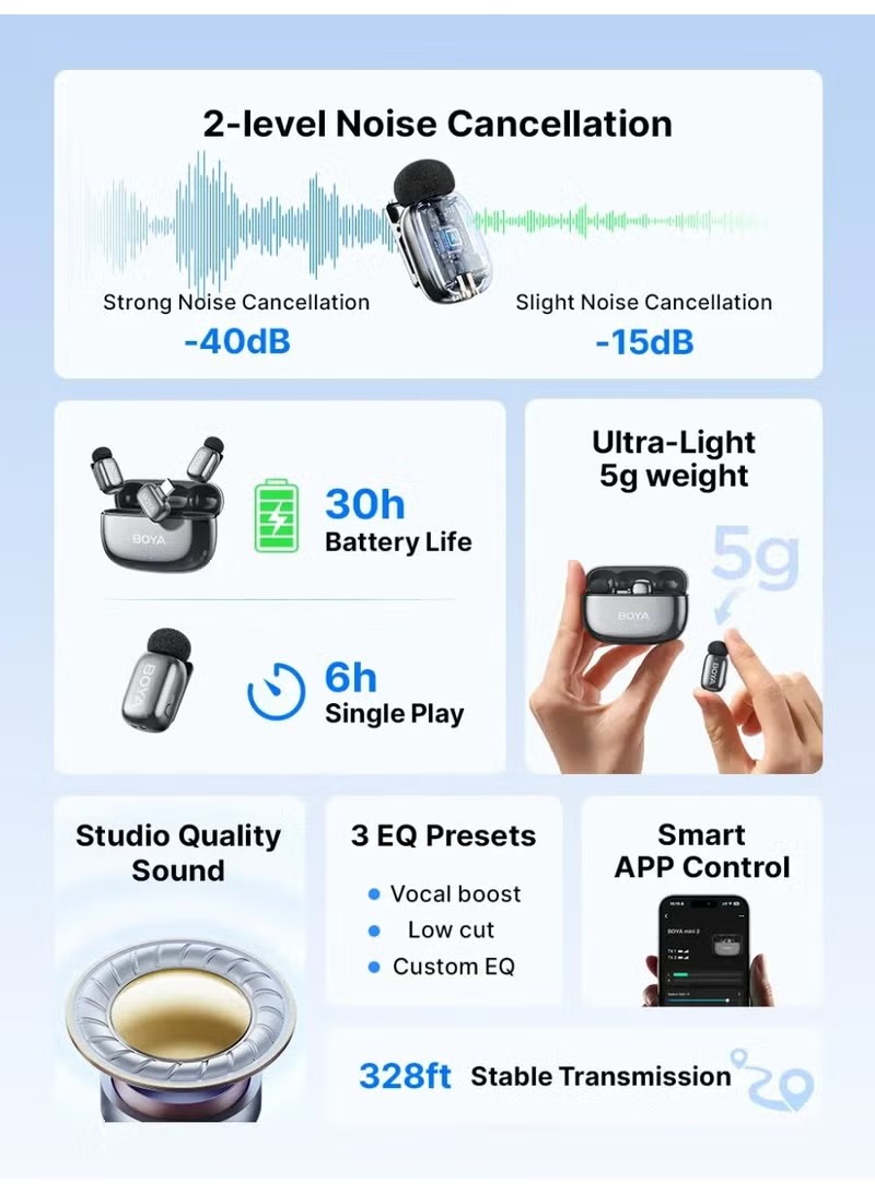 Smart App Control & Enhanced Audio – Take full command with the free BOYA Central app. Easily adjust gain, noise cancellation settings, and EQ presets directly from your phone. Capture broadcast-quality sound with 48kHz/24-bit resolution and a wide 120dB SPL handling