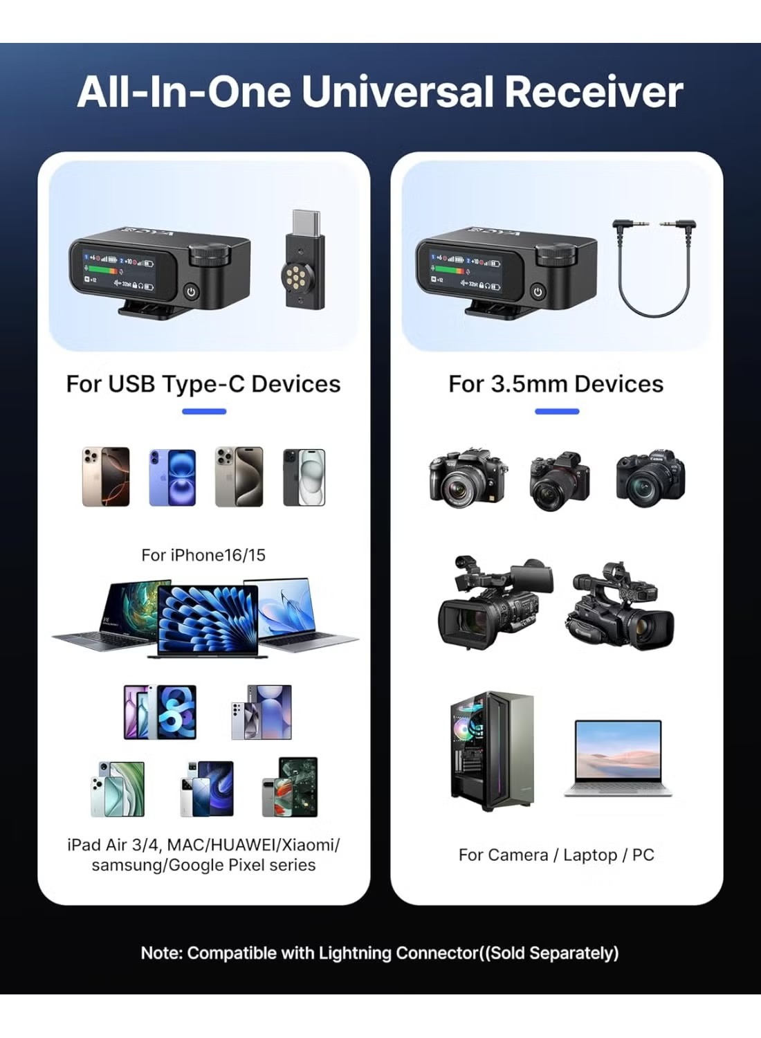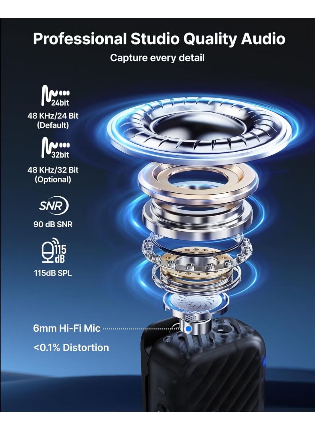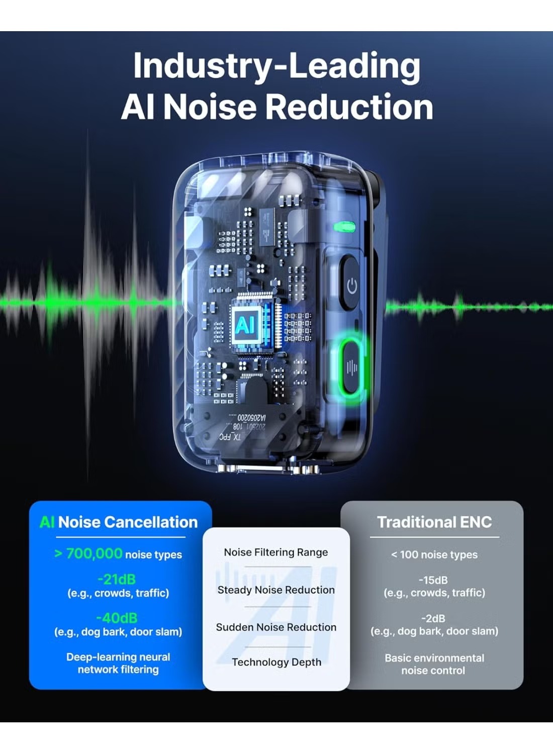 - Dual wireless lavalier microphones with AI Noise Cancellation for clear audio.