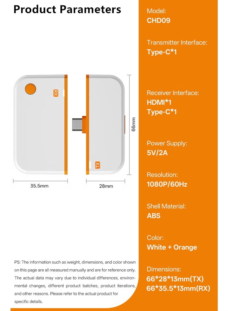 Wireless Screen Mirroring Device HDMI TO USB / HDMI TO TYPE-C Plug-and-Play Wireless HDMI Video Transmitter and Receiver 1080P compatible for Laptop/PC/Phone to Monitor/Projector/HDTV for Office Meetings/E-Games Features: 1. Plug-and-play: This wireless HDMI transmitter and receiver requires no downloads or apps to operate, making it incredibly easy to use with point-to-point transmission. 2. High Resolution Signal Interference: Supports video resolutions up to 1080P/720P with a built-in chip that prevents signal interference and lag, so you can enjoy clear and vivid images on a large screen. 1080P HD compatible HDMI wireless video transmitter and receiver, excellent lifelike image quality that won’t be compromised for sharing on a large screen. 3. Multi-Device Compatibility: This wireless HDMI-enabled adapter supports 1080P 3D movies, TV shows, video games, and presentations from laptops, PCs, smartphones, PS4/5, Switch, satellite boxes, HDSLR cameras, and more. Easy Installation: No drivers or messy wires are needed; simply connect and easily pair with your TV without affecting other wireless devices. Wirelessly mirror and share everything on the big screen, including pictures, online video games, online movies, web browsing, online shopping, documents, and more. Long-Range Transmission: In open areas, this wireless HDMI-enabled video transmitter and receiver can transmit audio/video signals up to 50 meters, with a transmission range of 10-30 m/33 ft-100 ft, even through a single wall. The transmission range is ideal for covering an entire meeting room or home, meaning you don’t need to buy excessively long HDMI-enabled cables.