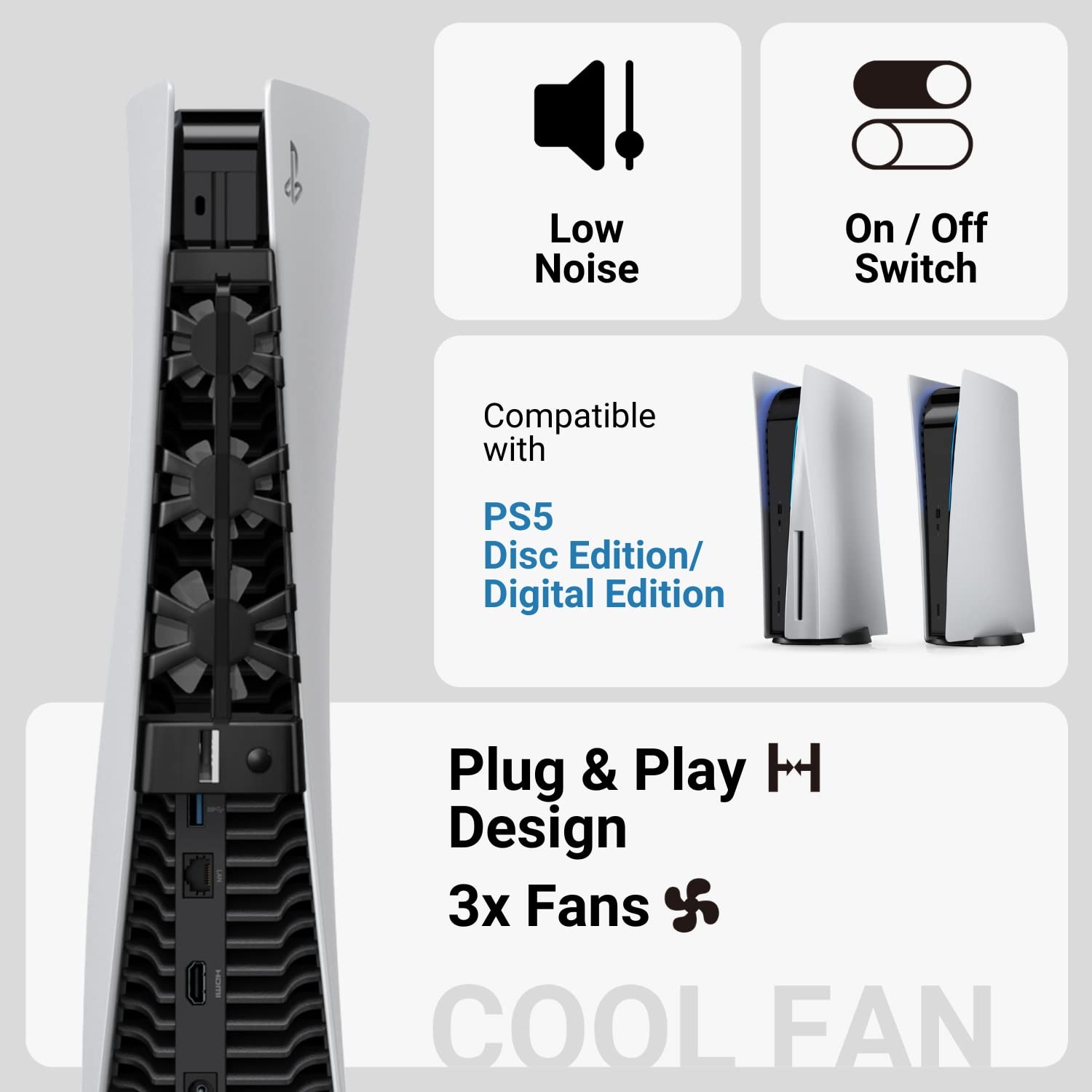 Enjoy superior cooling with this high-speed external cooling fan. Designed for silent operation, our fan lets you focus on your games or tasks without any distractions. A subtle blue LED light adds a touch of elegance and indicates when cooling is in progress, giving you peace of mind. With three built-in high-speed fans, this fan efficiently dissipates heat to prevent overheating, ensuring a longer lifespan and optimal performance. Plus, with an additional USB port, you don’t have to sacrifice your device’s connectivity for effective cooling. Our PS5 Digital Edition accessory is compatible with the disc version of the PS5 and is incredibly easy to use and install – simply plug and play! Made from durable and lightweight ABS material, it’s robust and portable. Whether you’re a gamer for hours or an extended work session, trust us to keep your console cool and running efficiently. Upgrade your cooling system now and experience the difference. Add this high-speed external cooling fan for your PlayStation 5 to your cart today!