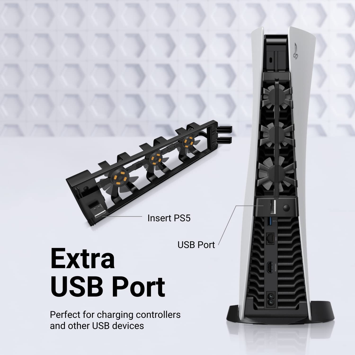 Integrated Design with Additional USB Port: This PS5 cooling fan provides an additional USB port, so you don’t have to sacrifice your console’s connections for cooling efficiency.