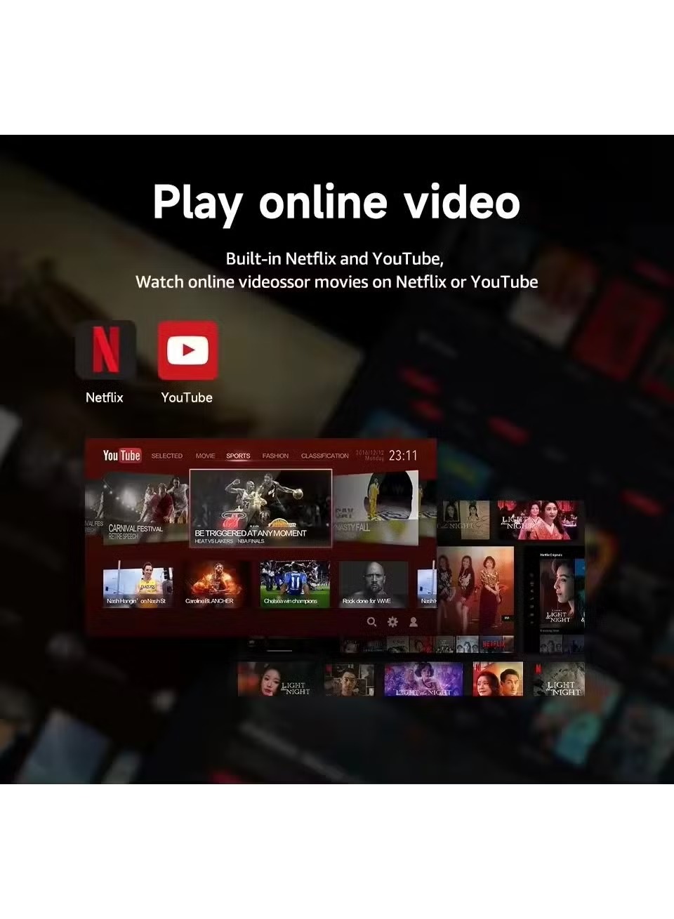 - Access popular apps like YouTube and Netflix, along with mirror projection capabilities.