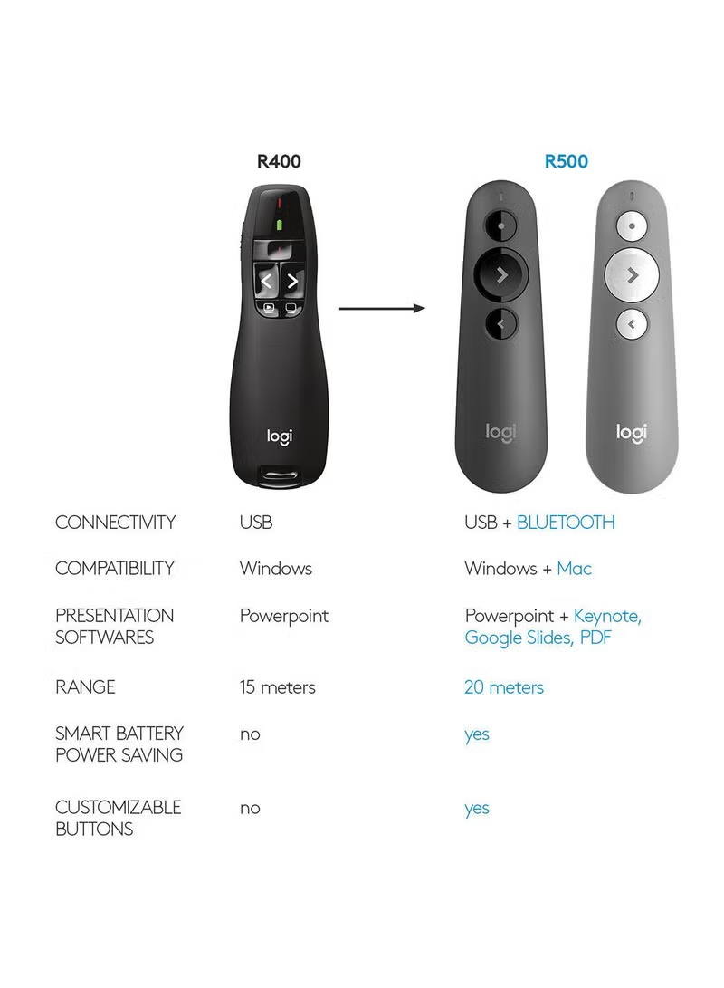 Giving a presentation in front of colleagues, employees or peers is now made easier and more informative with a durable presentation remote from Logitech. Having the flexibility to access your PowerPoint or other software with an embedded laser pointer will truly take your presentations to another level. The Logitech presentation clicker provides intuitive slideshow control and is also built to last – the durable construction provides extra strength in the event of an accidental drop. It’s lightweight, making longer presentations a breeze, plus it features a red laser pointer which allows the presenter to give crystal-clear explanations efficiently.The Logitech wireless presentation clicker will boost your confidence in front of an audience. The intuitive controls and red laser pointer makes any presentation easier, even in the darkest auditorium. The 15m range and battery indicator will help you personalise your presentation and give a relaxed delivery. Having the ability to connect with the audience through extra-range functioning improves your ability to sell your presentation. The R400 is also extremely easy to connect and set up: simply plug the receiver into a USB port and you’re ready to go. This wireless presentation clicker requires no software downloads or other setup procedures. Buttons are easy to find by touch and the smooth contours feel ideal in your hand. You’ll be in control from the first slide to the last. Battery Life (Laser Pointer) And (Presenter) : 20-hour Maximum And 1050-hour Maximum, Wireless Technology : 2.4 GHz Wireless Technology
