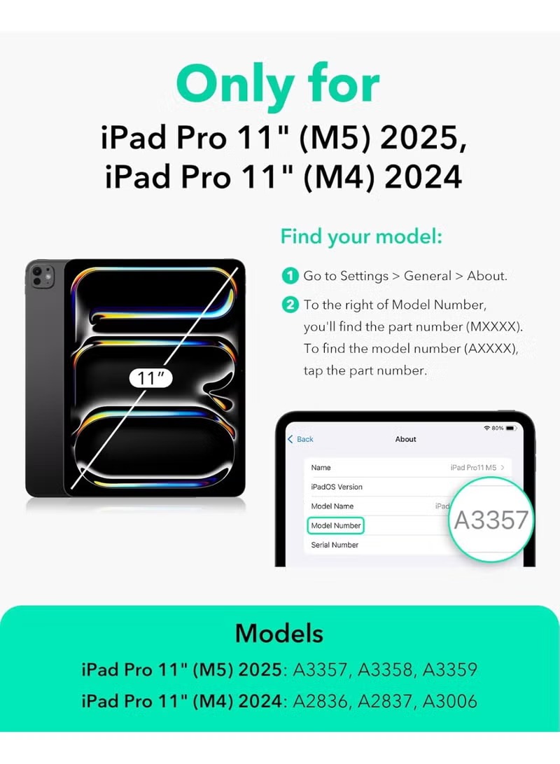 • Compatibility: only for iPad Pro 11″ (M5) 2025, Pro 11″ (M4) 2024, models: A3357, A3358, A3359, A2836, A2837, A3006, not compatible with any other iPad models