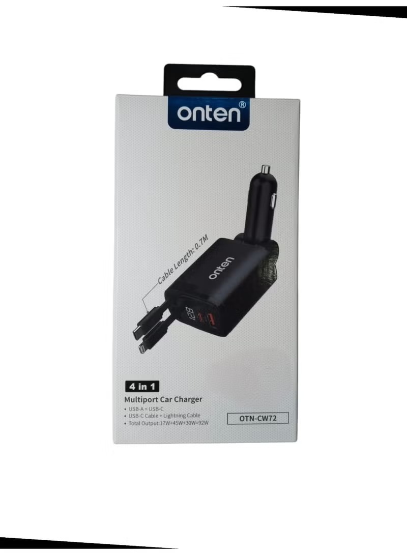 Onten OTN-CW72 4-in-1 Retractable Car Charger – Output power 92W Lightning and USB-C cables, plus USB-A and USB-C ports