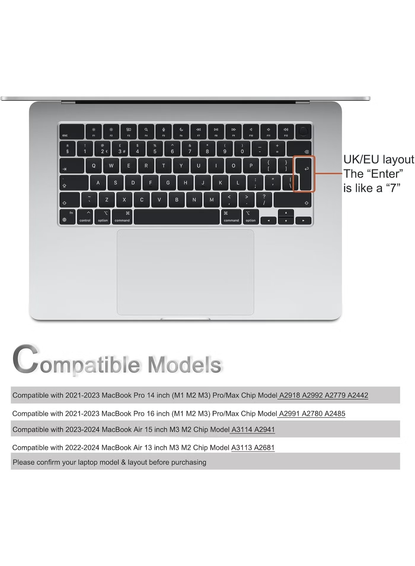 COMPATIBLE MODEL: Compatible with MacBook Air 15 inch & 13 inch M3 M2 Chip model A2941 A2681 (released in 2024 – 2022) & MacBook Pro 14 inch & 16 inch M3 M2 M1 Max/Pro Chip model A2918 A2992 A2991 A2779 A2780 A2442 A2485 (released in 2023 2021) UK and EU layout (The apperance of “Enter” key is like the “rectangle”). Please confirm your product model before purchasing