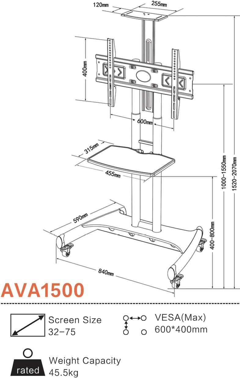 Suitable for 32″-70″ flat or curved LCD, LED, OLED, plasma displays and TVs EASY ASSEMBLY: The TV cart includes a manual and hardware for easy assembly. Recessed columns with cable slots provide a wire management solution to keep connections clean and tidy RESIDENTIAL OR COMMERCIAL: The portable floor standing TV stand is a great choice for home use or commercial locations including shopping mall, office, conference room and trade show PORTABLE DESIGN: This rolling TV stand features lockable wheels to secure the unit once it is in position. When opened, the TV cart moves easily from one place to another Adjustable Height: Adjust the height of the TV panel to choose a comfortable viewing position Rack for electronic devices including DVR, DVD, Blu-ray player, cable box, game console, Xbox, PS3 A perfect match for most scenarios, you can easily move your monitor or TV around your home or office. The TV cabinet on wheels is ideal for video conferencing or presentations at trade and business fairs, classrooms, computer games, hotels, shopping malls, entertainment centers and more