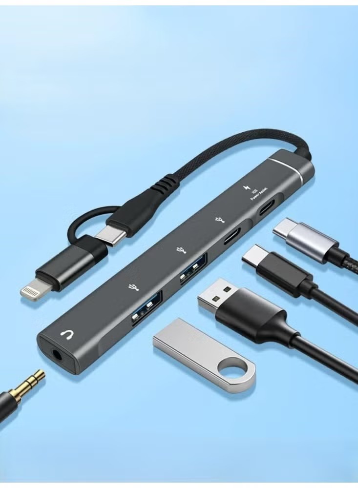 USB C/Lightning Hub, 5-in-1 MultiPort Adapter Dock with 2 x USB-C, 1 x USB A, SD/audio jack 3.5mm Slot USB Splitter Compatible with iPhone/iPad Pro,PC,MacBook Air/Pro,Laptop,PS5/PS4 More Type C Devices