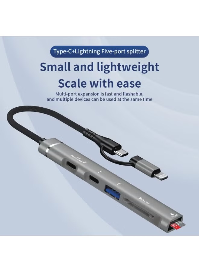 USB C/Lightning Hub, 5-in-1 MultiPort Adapter Dock with 2 x USB-C, 1 x USB A, SD/TF Card Reader Slot USB Splitter Compatible with iPhone/iPad Pro,PC,MacBook Air/Pro,Laptop,PS5/PS4 More Type C Devices